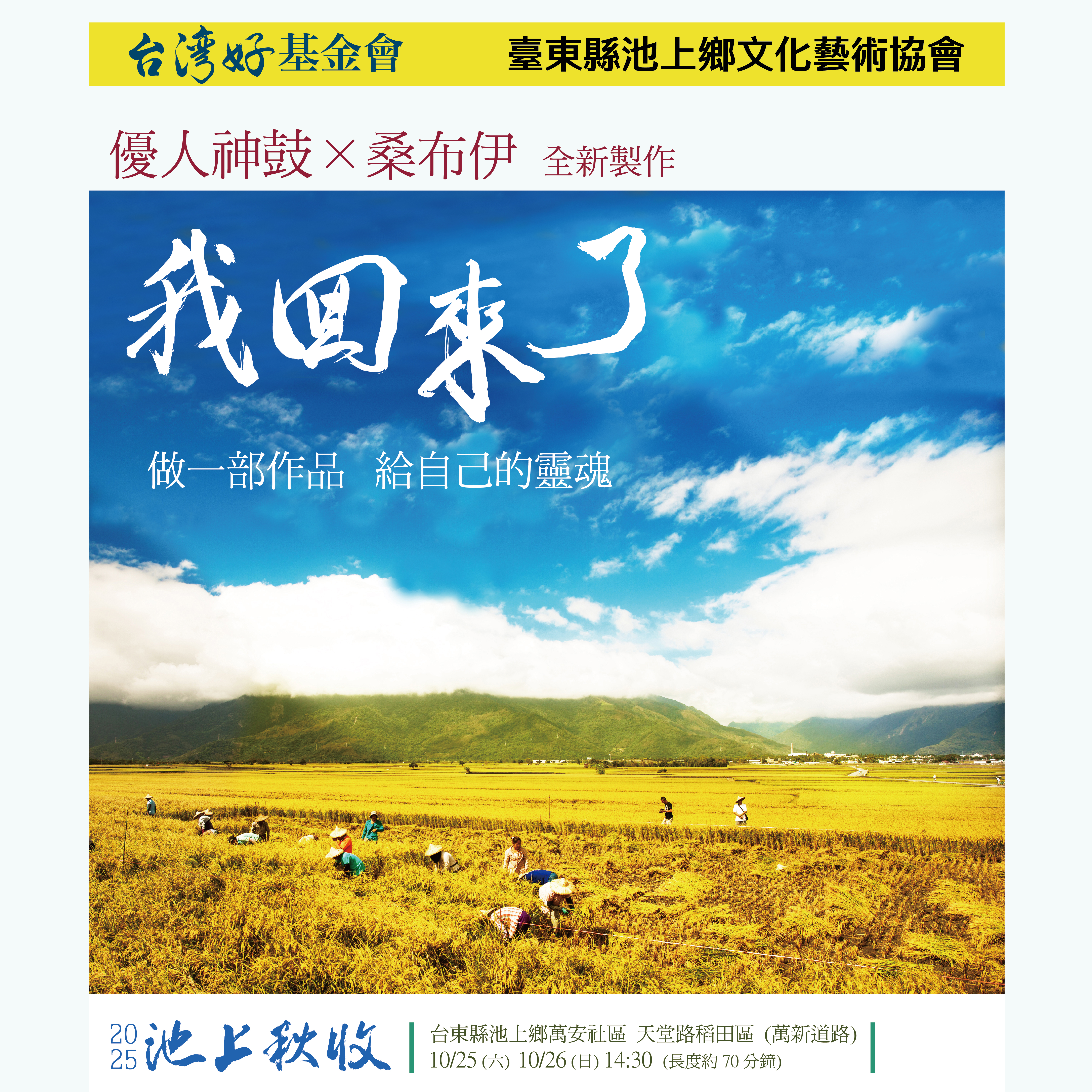 活動預告 《我回來了── 做一部作品給自己的靈魂!》 2025池上秋收稻穗藝術節-優人神鼓與桑布伊首度合作。以《我回來了-做一部作品給自己的靈魂!》為題,從大自然元素中,重新省思人與自然的關係。祖靈透過人們的靈魂把對土地的擔憂傳給了我們的心!人類要喚醒自己的靈魂,要聆聽土地、樹林、風雨給予的訊息!此次共同創作以歌聲、鼓聲作為生活與生命媒介的全新作品。讓我們回到與靈魂合一的安心處!回到儀式、回到靈魂的深處,輕輕的跟他說,「我回來了!」。 more 活動分享 2025池上秋收稻穗藝術節邀請優人神鼓與金曲歌手桑布伊首度攜手合作,推出全新製作<我回來了 – 做一部作品給自己的靈魂!>,一段關於勇氣、信任與愛的旅程。優人神鼓創辦人劉若瑀將桑布伊的原創音樂與吟唱,融合優人藝術總監黃誌群的鼓與藝,交織成一場跨界儀式劇場,讓觀眾在鼓聲與歌聲之間,學習與萬物對話,回到與自然、與自己相遇的地方。 more 活動紀錄 影片 2025池上秋收稻穗藝術節:我回來了一做一部作品給自己的靈魂