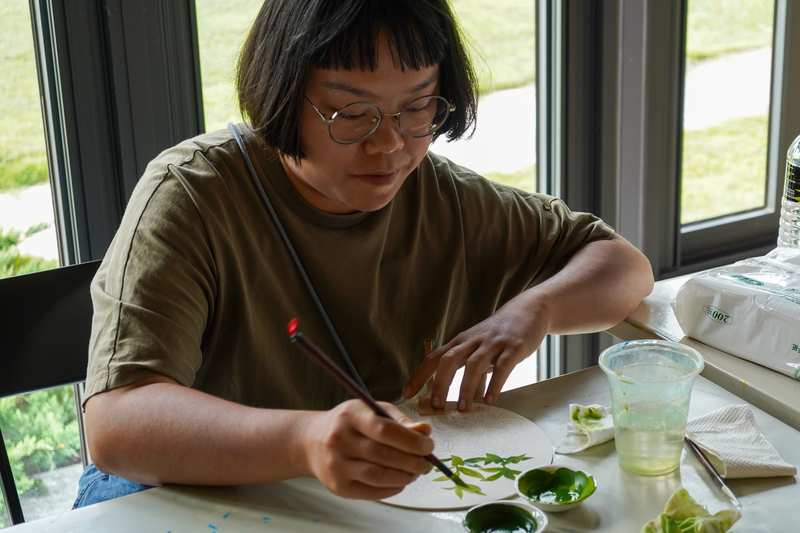 本次工作坊由訪問藝術家 葉采薇 帶領,帶來數款來自生活週遭的植物畫稿,引導學員於素雅團扇上進行膠彩描繪 ,一筆一劃寫下對自然的觀察與感受。