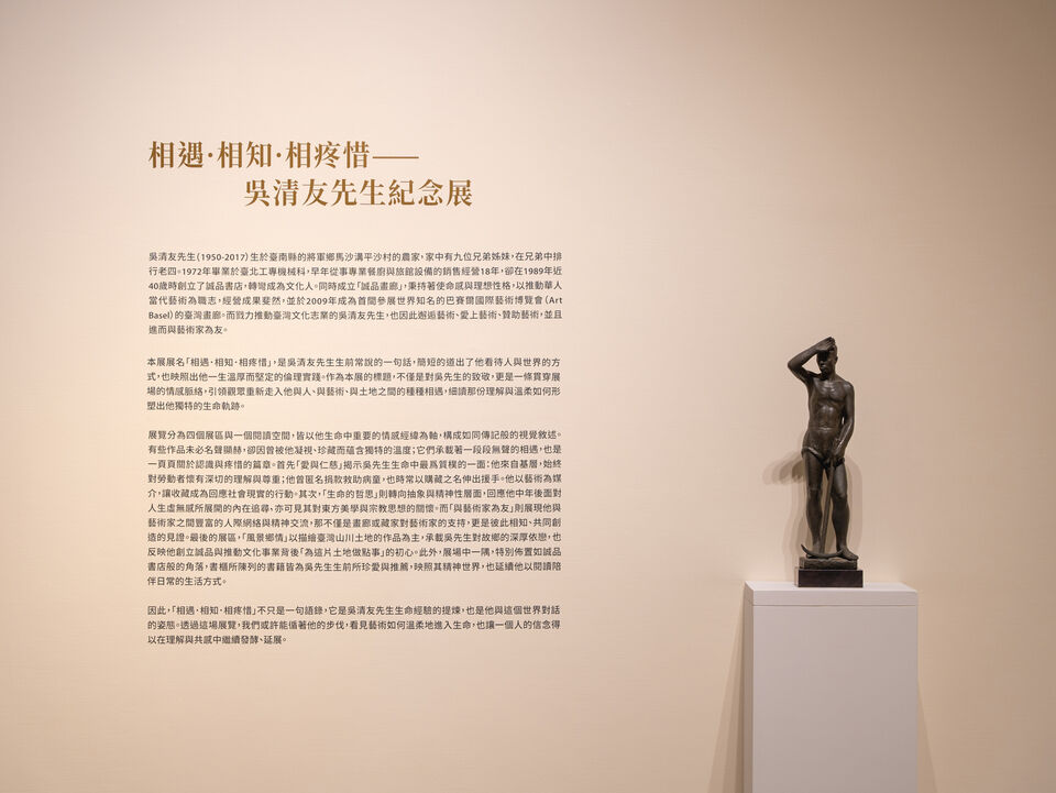 因此,「相遇.相知.相疼惜」不只是一句語錄,它是吳清友先生生命經驗的提煉,也是他與這個世界對話的姿態。透過這場展覽,我們或許能循著他的步伐,看見藝術如何溫柔地進入生命,也讓一個人的信念得以在理解與共感中繼續發酵、延展。